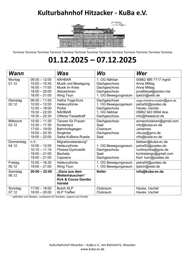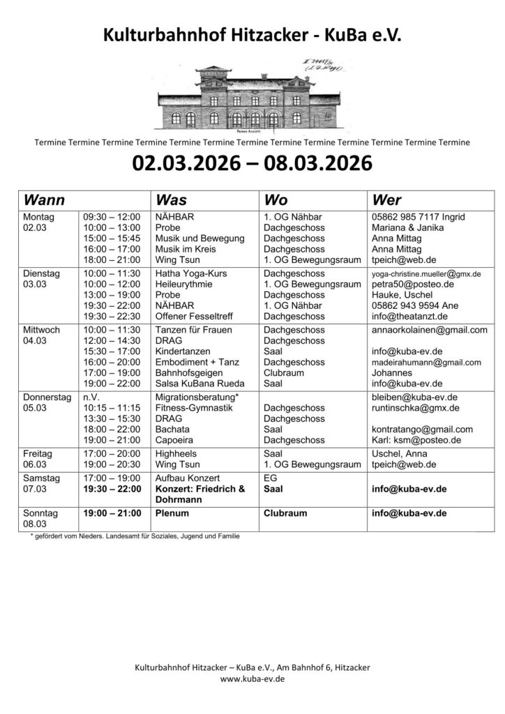 Der Kulturbahnhof Hitzacker e.V. ist ein auf basisdemokratischen, ehrenamtlichen Strukturen basierendes Kultur- und Veranstaltungszentrum. KuBa ist ein interkulturelles, diverses Forum zur freien Entfaltung von Kunst und Kultur.