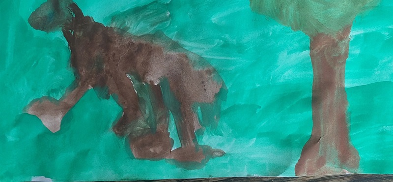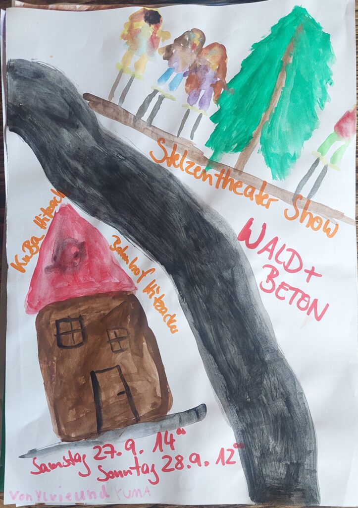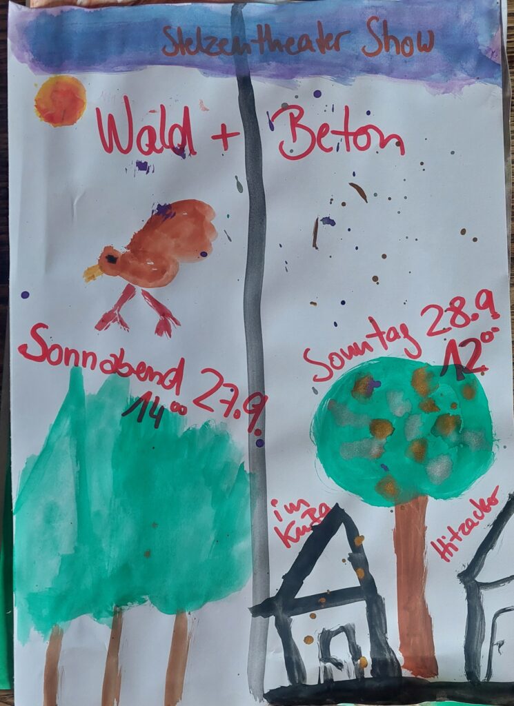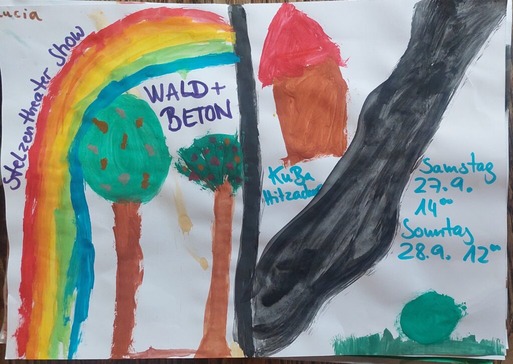 Die Gruppe begann mit dem Thema „Wald“ zu arbeiten, auch draußen. Sie stellten fest, dass so vieles miteinander verbunden und verwoben ist, dass Pflanzen und Pilze und Tiere irgendwie miteinander sprechen oder sich mitteilen und kreierten unter der künstlerischen Leitung von Anna Orkolainen und Ursula Pehlke ihre Aufführung „Wald und Beton“.