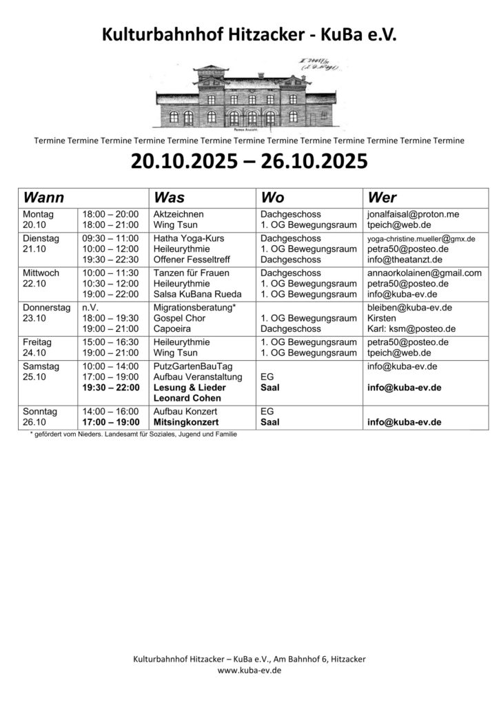 Der Kulturbahnhof Hitzacker e.V. ist ein auf basisdemokratischen, ehrenamtlichen Strukturen basierendes Kultur- und Veranstaltungszentrum. KuBa ist ein interkulturelles, diverses Forum zur freien Entfaltung von Kunst und Kultur.